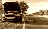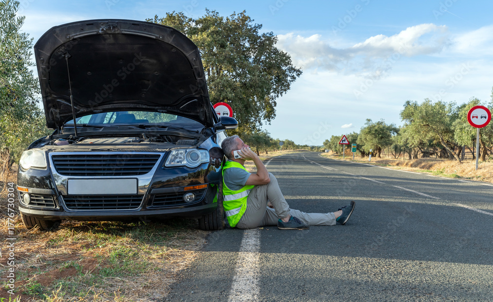 Driver with reflective vest calling for roadside assistance after car breakdown with open hood.