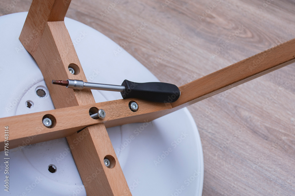 Close-up of furniture assembly process showing screwdriver, metal screws, and wooden chair parts with white metal bracket on laminate floor.