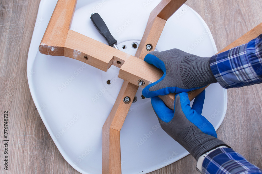 Close-up of a man assembling a wooden chair using a screwdriver. Concept of DIY home repair, furniture assembly, craftsmanship, and handyman work.