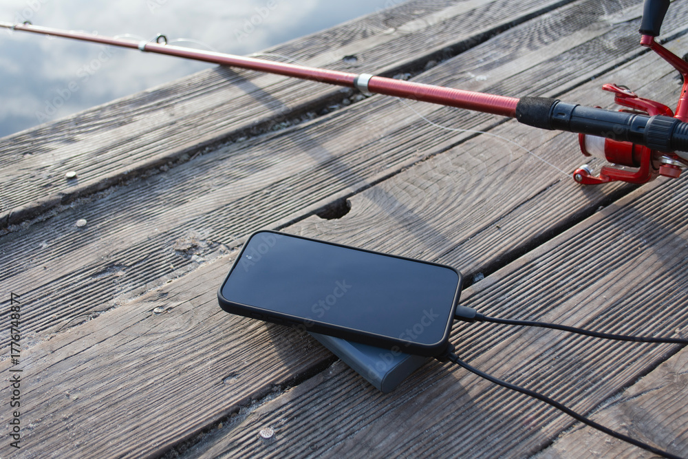 Portable power bank charging smartphone outdoors on a wooden pier next to a fishing rod. Concept of mobility, travel, adventure, and staying connected in nature.