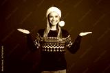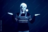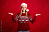 Funny santa girl in red sweater smiles boldly in festive Christmas scene with holiday magic and cozy winter vibes for seasonal campaigns