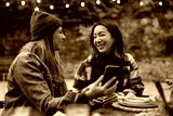 Happy women using smart phone at picnic table in backyard in autumn day.