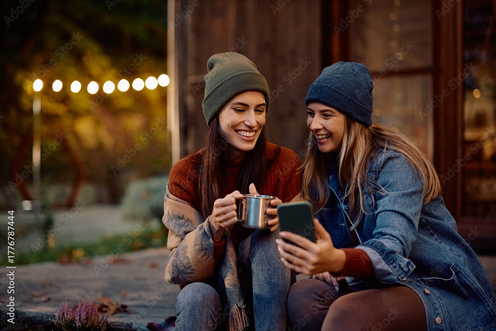 Happy female friends using smart phone during autumn day in backyard.