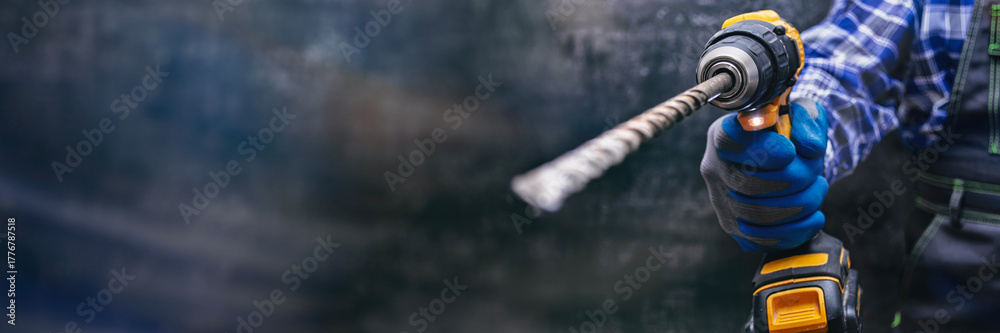 Close-up of a construction worker holding a power drill with a metal bit, pointed toward the camera. Concept for professional craftsmanship, renovation and industrial safety.