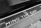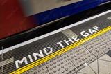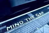 Mind the Gap - Achtung Spalt - Warnhinweis mit vorbeifahrendem Zug in London