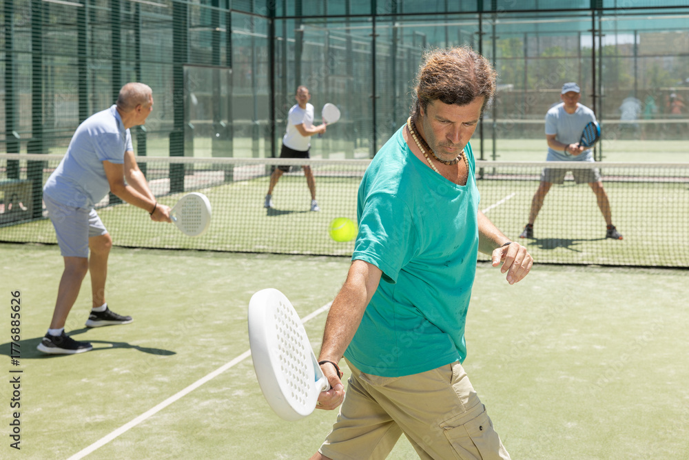 Adult and elderly men paddle tennis doubles players play against two men on tennis court