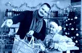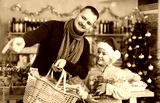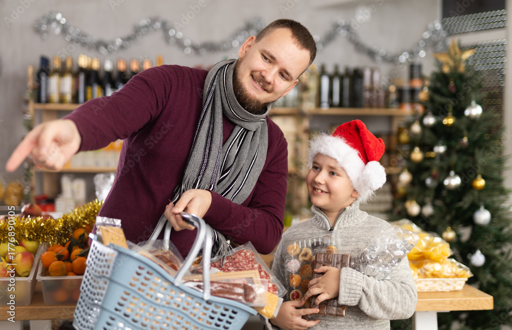 Happy dad and son are deciding what to buy for New Year celebration in supermarket