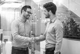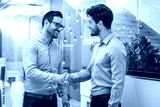 Two smiling business men shaking hands together after successful meeting.