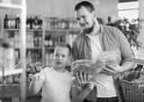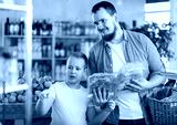 Young father and preteen son shopping together in grocery store, selecting packaged cut poultry parts and friendly talking