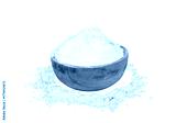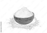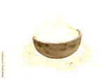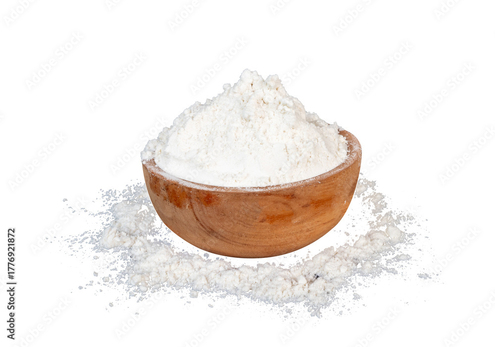 flour spilled from a wooden bowl with a white isolated background