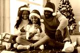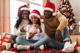 A joyful African American family sits on the floor at home, putting coins into a piggy bank. The parents teach their daughter about saving money for the future while celebrating Christmas.