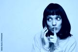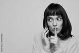 A thoughtful portrait of a young woman in a yellow sweater, listening on a phone while signaling for quiet, set against a soft pink studio background.