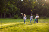 Happy family spending summer time holiday together outdoors in green park, interacting with colorful kite, enjoying play together, recreational activity outdoor, active friendly parents and children