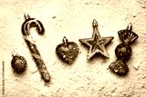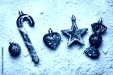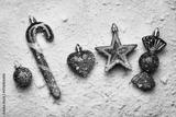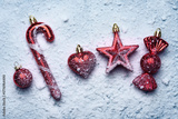 Red Christmas ornaments covered on snow background. Festive winter decoration including bauble, candy cane, heart, star and sweet-shaped ornaments. New Year greeting cards