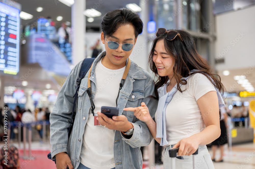 Asian couple tourist woman pointing at man's phone going on a trip waiting for departure in airport.