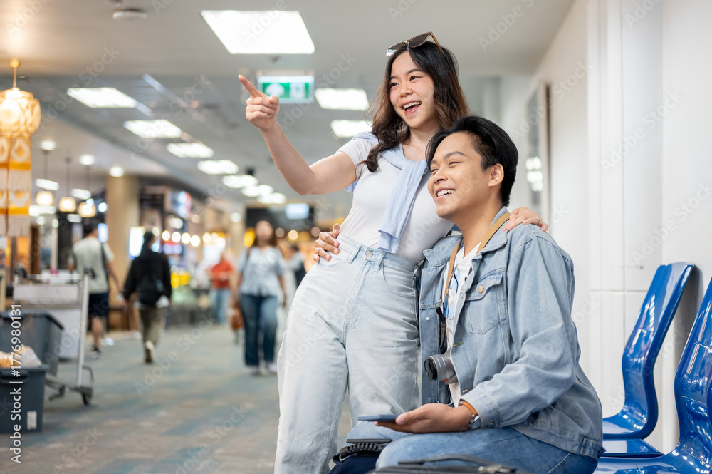 Asian tourist couple go on trip woman pointing aside sitting man as waiting for departure in airport