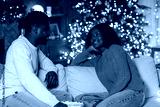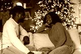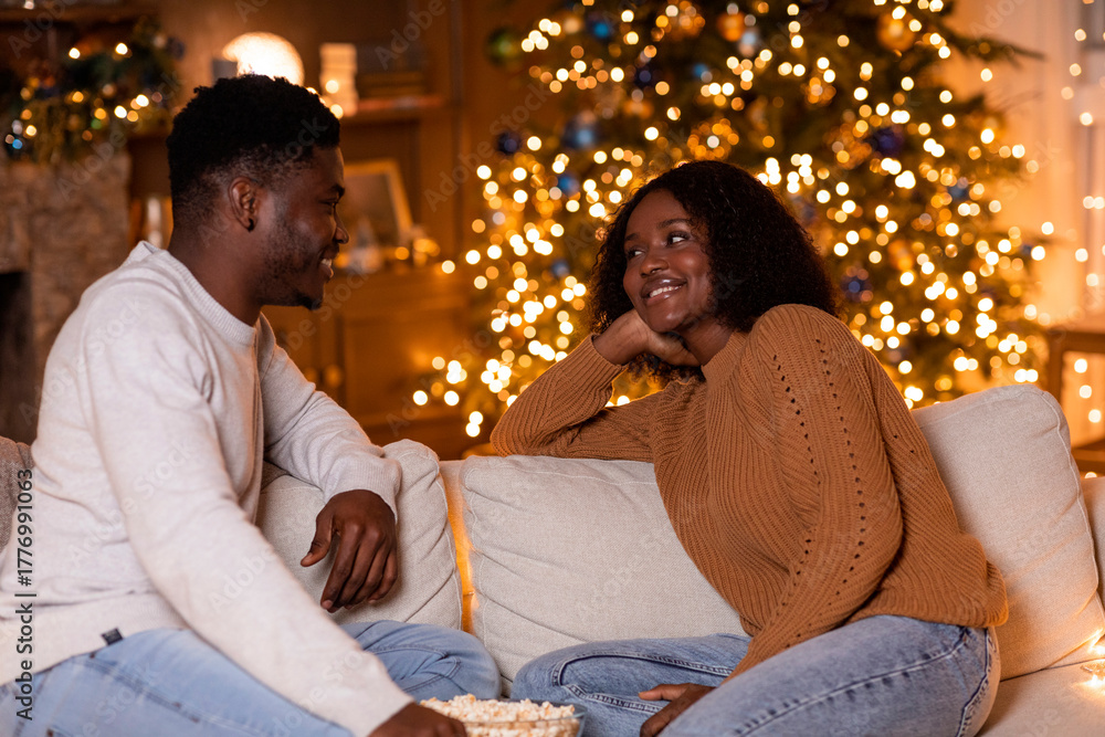 Smiling young African American husband and wife sit on a sofa in their living room, enjoying popcorn while talking. A decorated Christmas tree with glowing lights adds to the festive atmosphere.