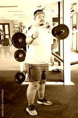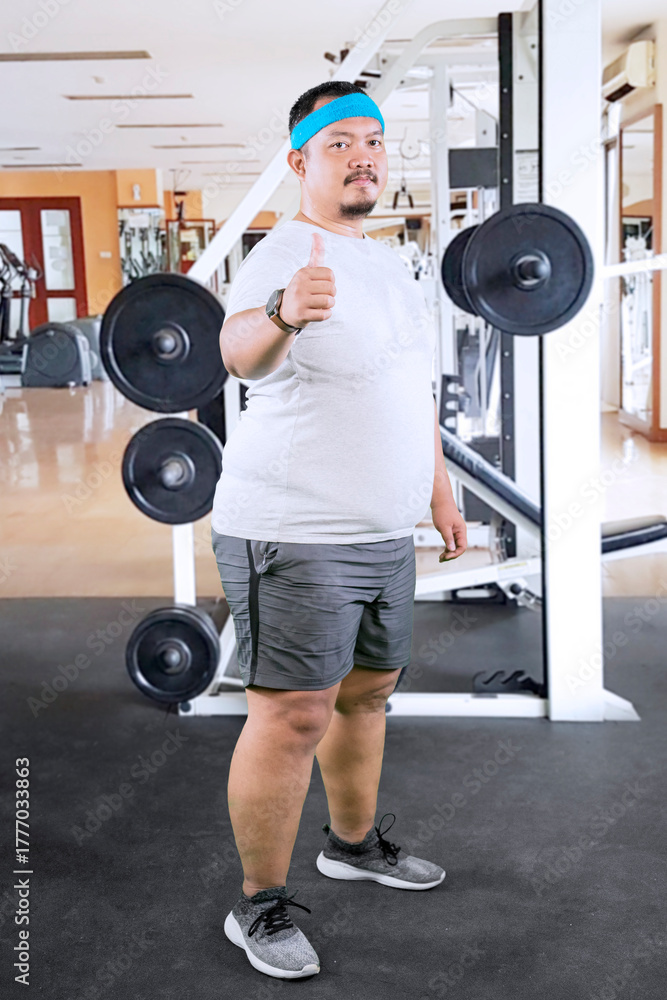 Happy Overweight Asian Man Showing Thumbs Up for Fitness Progress at the Gym