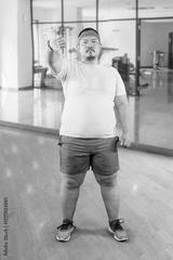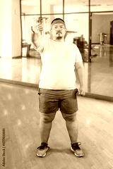 Disappointed Overweight Asian Man Showing Thumbs Down for Failed Fitness Goals at the Gym
