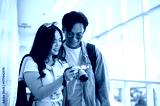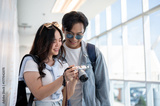 Asian tourist couple go on trip woman holding camera showing photos to man while standing in airport