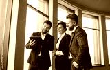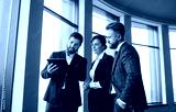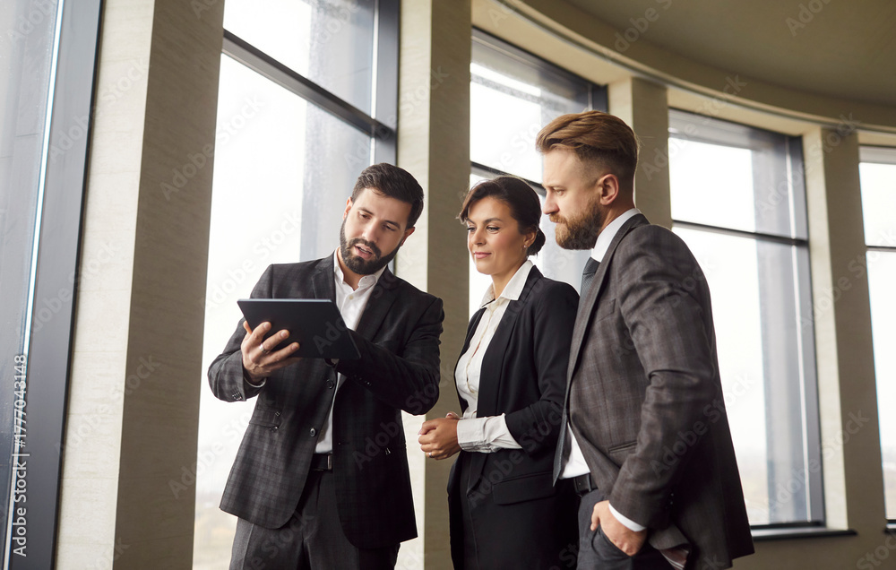 Three business professionals analyzing data on digital tablet in modern office with panoramic windows. Realtor presenting apartments or office space to clients, discussing terms for purchase or rent.
