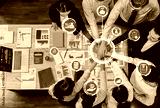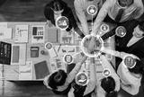 A dynamic business team collaborates in a strategy meeting with hands united over data analysis and tax planning visualized through innovative technology. Amity