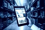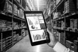 Warehouse management innovative software in computer for real time monitoring of goods package delivery . Computer screen showing smart inventory dashboard for storage and supply chain distribution .