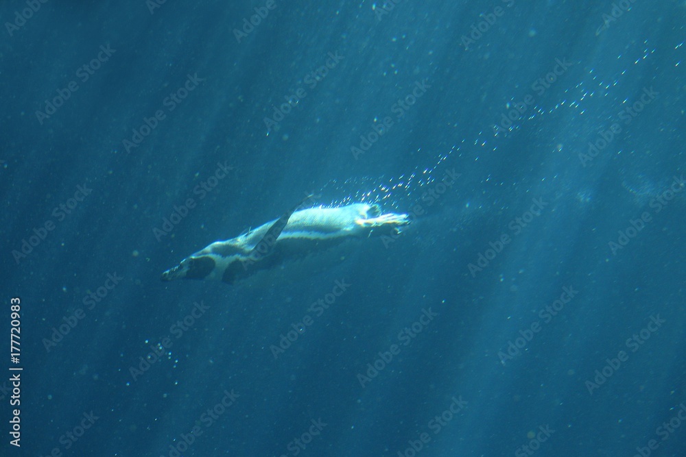 Cute little megallenic penguin in the water. Beautiful and cute little bird. Wild animals in captivity. Spheniscus magellanicus.
