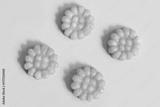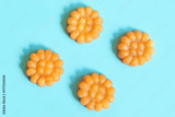 Traditional Korean honey cookies yugwa on blue background, top view.