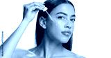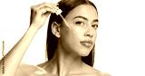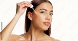 Beauty, woman and skincare with dropper in studio for skin hydration, healthy glow or hyaluronic acid. Portrait, girl and retinol oil on white background for acne treatment, cosmetics or mockup space