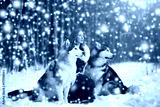 Attractive woman with the dogs. Huskies or Malamute. Christmas