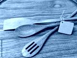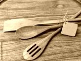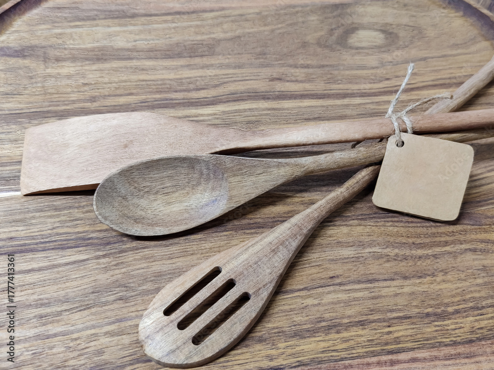 Set of wooden kitchen utensils on wooden background. Wooden spoons and spatulas are popular kitchen utensils that do not scratch non-stick coatings. Close-up. Copy space.