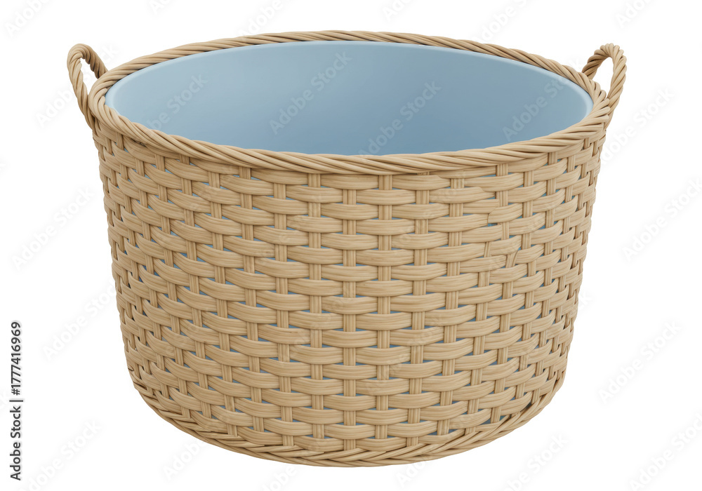 Isolated woven basket with light blue interior; natural-fiber container for decor, plants