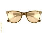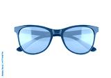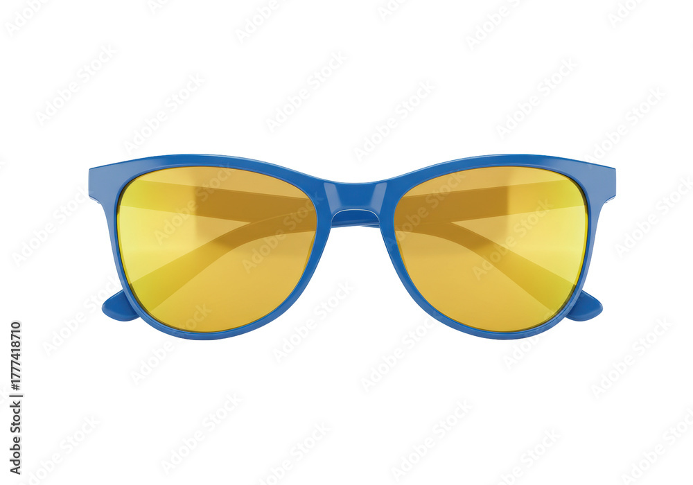 Isolated blue-framed sunglasses with amber-tinted lenses on a light surface, stylish eyewear