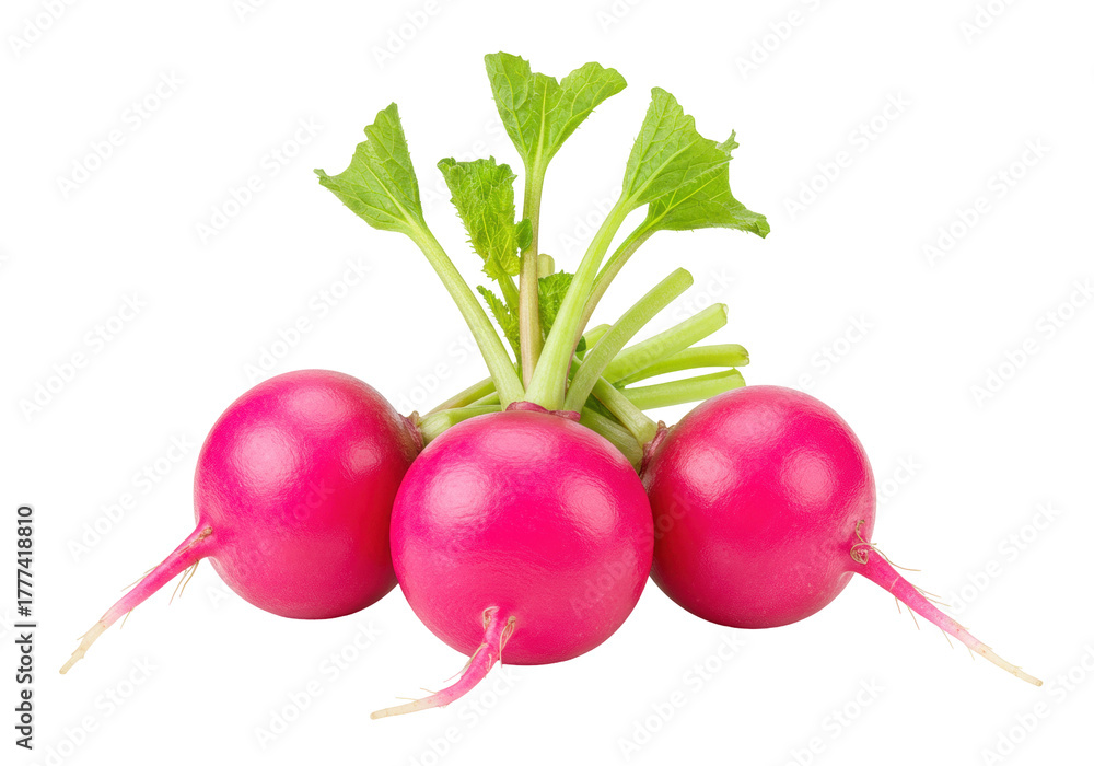 Isolated radishes close-up, fresh pink roots with green leaves on top, spring healthy food