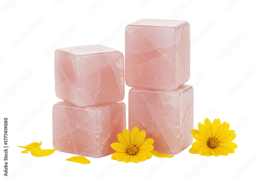 Isolated stack of pink quartz crystals with yellow daisy flowers and petals below them