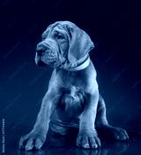Posing purebred Great Dane puppy with an orange collar on a dark background
