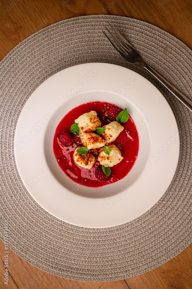 Cottage cheese dumplings with raspberry sauce – homemade dessert on table