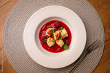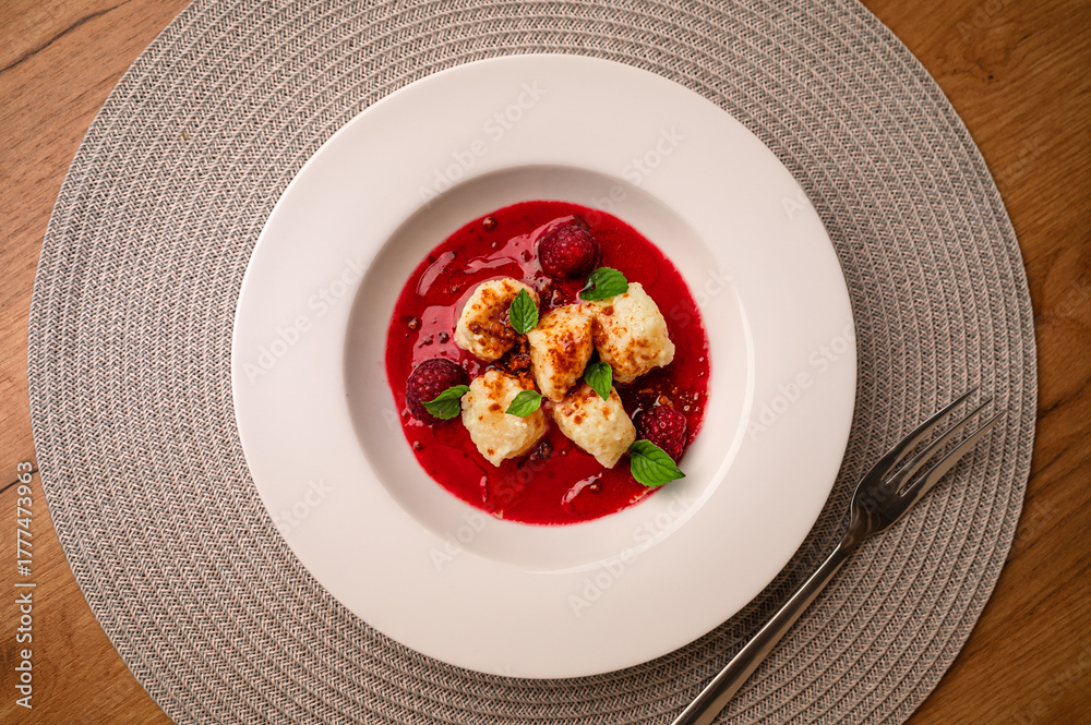 Cottage cheese dumplings with raspberry sauce – homemade dessert on table