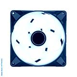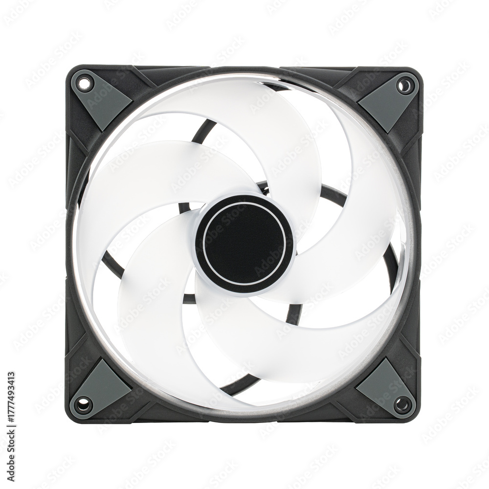 RGB computer case fan isolated on white background. The fan features translucent blades.
