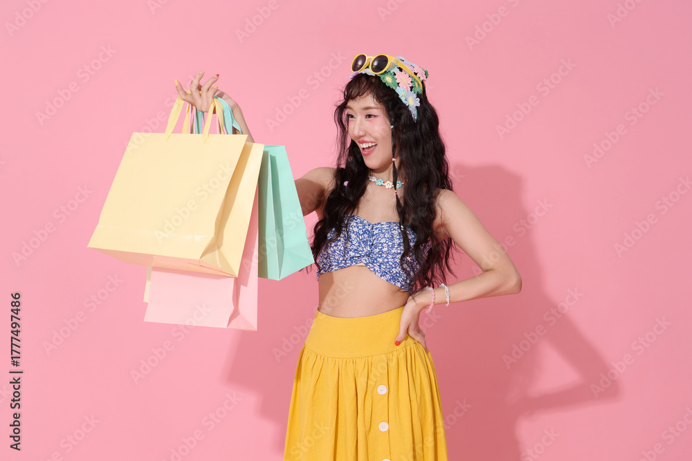 Happy Asian woman holding pastel shopping bags expressing joy modern lifestyle summer fashion and retail happiness concept isolated on pink background.