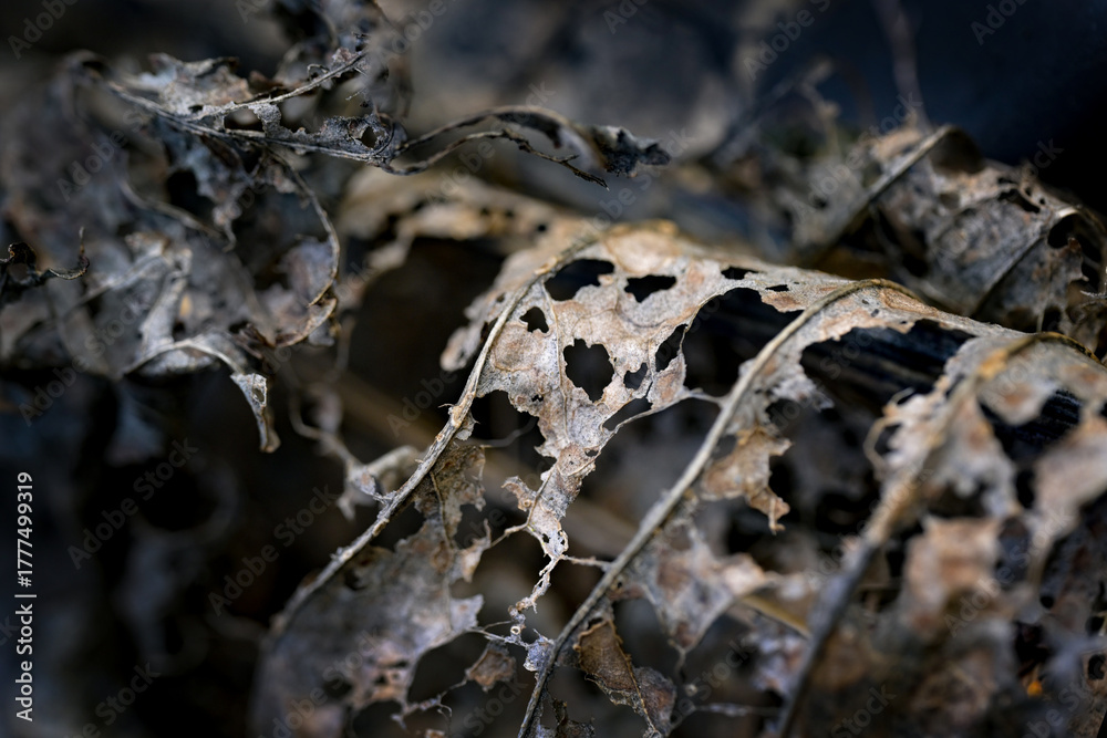 Decaying leaf of horseradish with holes and fragile veins and at the end of the year in fall and winter, concept of transience or wabi sabi, texture and structure of nature,