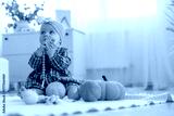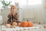 Playing with toy. Cute little baby is sitting on the floor at home with pumpkins toys