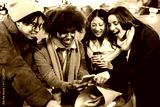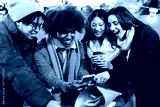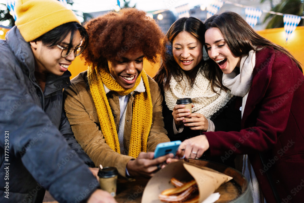Four cheerful multi-ethnic friends looking at smartphone and having fun together at wintertime at a christmas market, drinking coffee and eating pretzels