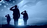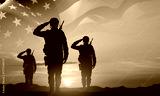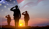 Silhouettes of a soldiers with USA flag against the sunset. Memorial Day, Veterans Day