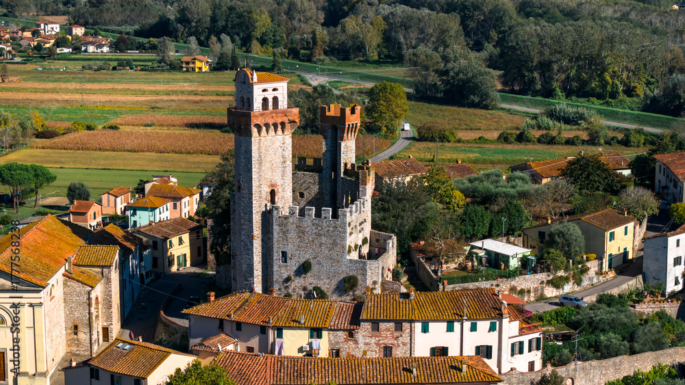 Tuscany, Italy. Castello di Nozzano, a medieval well-preserved castle located in the village of Nozzano Castello, near Lucca. aerial drone panoramic view