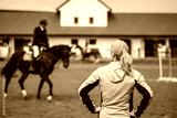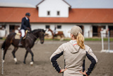 Female horse trainer supervising rider training before equestrian show jumping in paddock