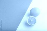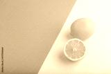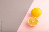 Yellow Lemon Cut in half on gray and pink pastel paper, Side view, copy space