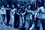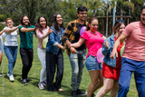 Diverse large group of latin american young people having fun playing conga line outdoors in a park in Mexico. Hispanic multi generation family or friends enjoying time together in outdoor activities