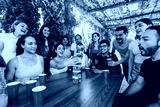 Diverse large group of latin american people playing with wooden building blocks at home in Mexico. Hispanic multi generation family or friends enjoying time together in board games concept.